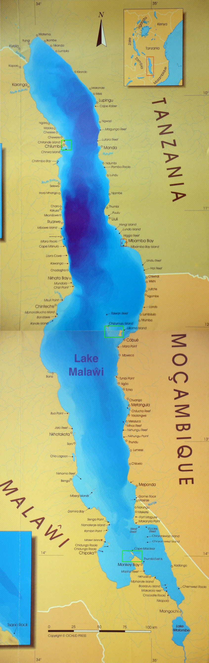 Carte empruntée à Ad Konings dans le livre Les Cichlidés du Malawi dans leur milieu naturel